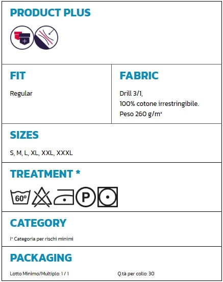 Pantalone da lavoro con chiusura della patta con cerniera e bottone in cintura, elastico in vita, una tasca posteriore applicata a destra con aletta e velcro, due tasche anteriori interne, un porta metro, travette varie di colore a contrasto.