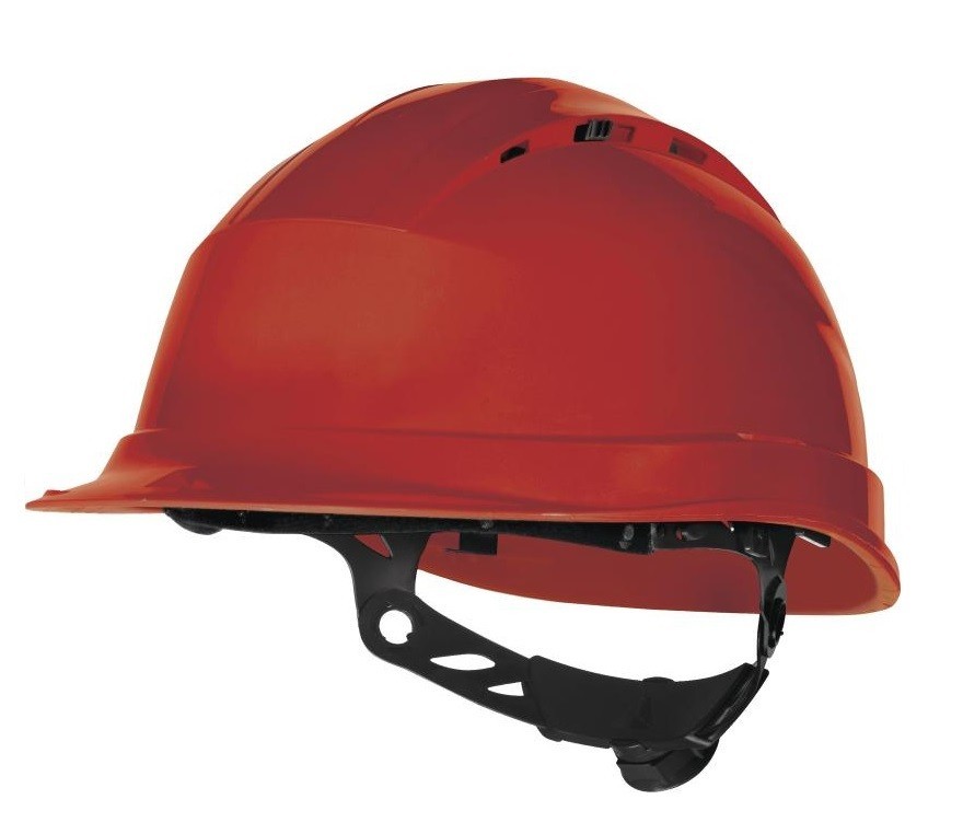 Elmetto da cantiere ventilato COLORE ROSSO, polipropilene (PP) alta resistenza trattato anti-UV. Calotta poliammide : 3 Fasce tessili con 8 punti di fissaggio. Frontalino spugna. Sistema di serraggio Rotor : giro-testa da 53 a 63 cm. 2 posizioni possibili del girotesta (alto/basso) per un miglior comfort.