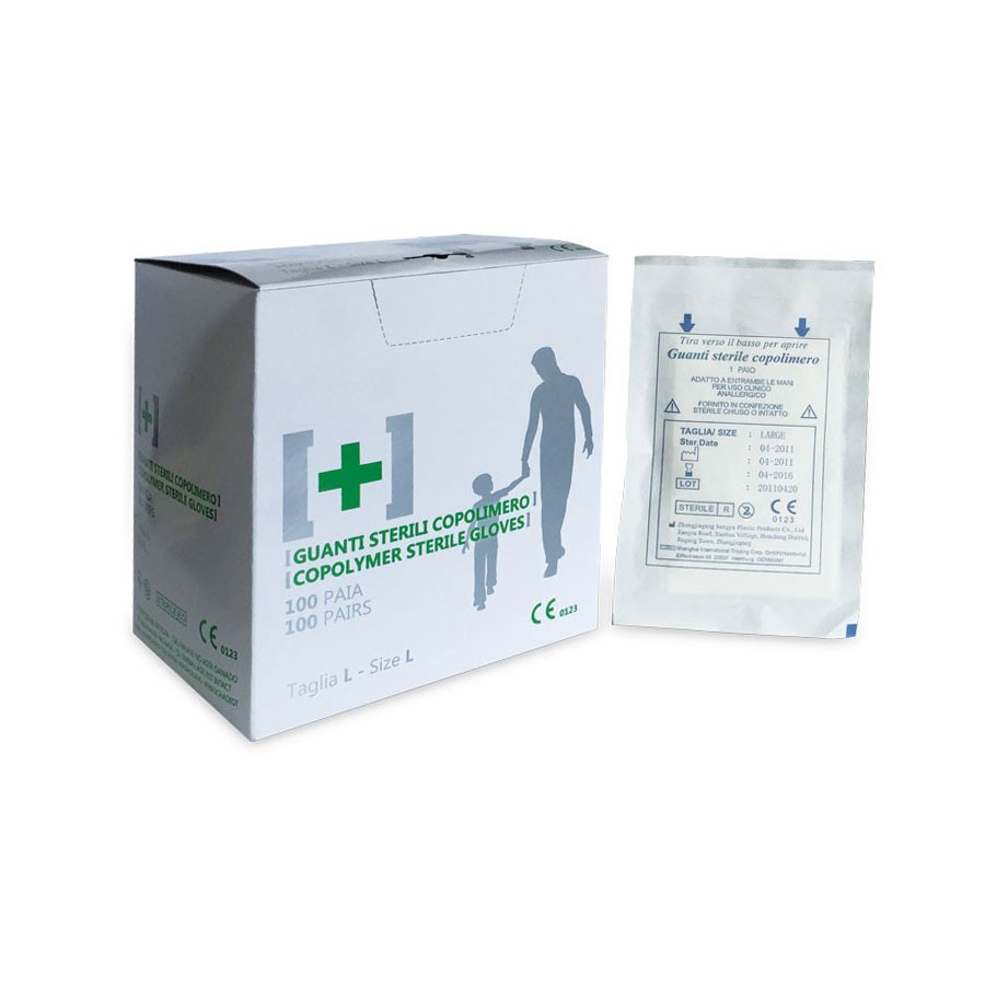 Guanti sterili in copolimero confezionati al paio.
