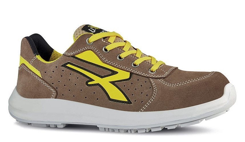 Scarpe antinfortunistiche basse, leggere e comode U-Power della linea Red UP, con tomaia in morbida pelle scamosciata forata ultra traspiranti e puntale in alluminio, antiperforazione, antiscivolo e suola PU/PU High Rebound in Elastopan di Basf S1P SRC ESD.