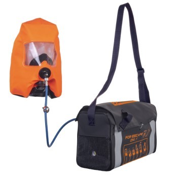 E' composto da una bombola, da una valvola/riduttore di pressione, da un tubo di respirazione, da un cappuccio e da una sacca di contenimento. La bombola da 2 l a 300 bar è collegata direttamente alla valvola / riduttore provvista di indicatore di carica che indica in continuo la pressione all’interno della bombola. Alla valvola/riduttore è collegato il tubo di respirazione che alimenta il cappuccio e che è posizionato all’interno della sacca in modo da attivare il flusso automaticamente all’estrazione del cappuccio. Il cappuccio è dotato di visore a grande visibilità.