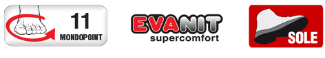 SOLETTA: EVANIT, con speciale mescola di EVA e nitrile, ad elevata portanza e spessore variabile (12mm - 8mm - 3,8mm). Termoformata, anatomica, forata e rivestita in tessuto altamente traspirante. Antistatica grazie ad uno specifico trattamento superficiale e a cuciture realizzate con filati conduttivi