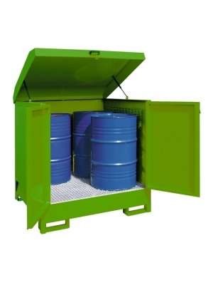 Con allestimento interno di supporti è possibile lo stoccaggio in orizzontale di fusti da 200 lt e fusti da 60 lt.