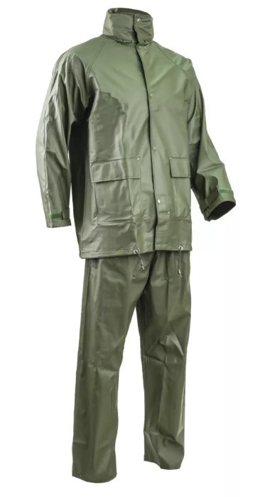 Materiale esterno >> PU/PVC su supporto in poliestere (300 g/m2), cuciture nastrate, occhielli di ventilazione GIACCA Colletto >> Cappuccio Chiusura frontale con elastico e coulisse Chiusura >> Cerniera singola con patta con bottone automatico Maniche >> Rifinite con elastico antivento Tasche >> 2 tasche esterne. pattina orizzontale piatta bassa con velcro PANTALONI Taglia >> Pantaloni elastici Apertura >> Passamano Gambe >> Rifinito con pressione per stringere