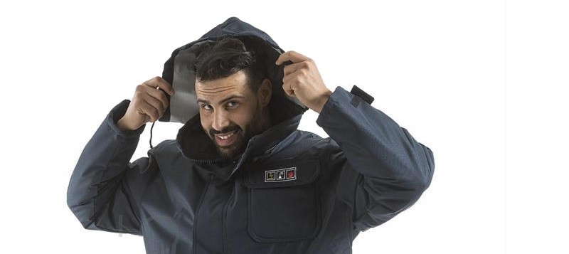 Giaccone chiusura con cerniera in plastica ricoperta da patella con velcro alle estremità.
